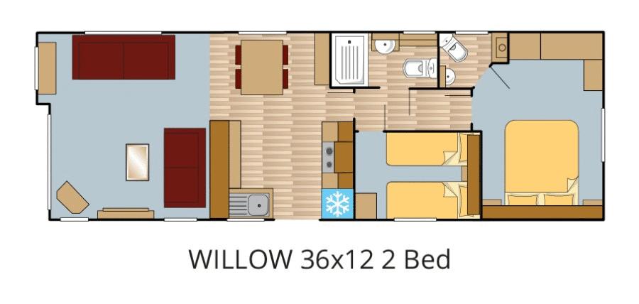 The Europa Willow is a 36′ x 12′ lodge with double glazing and central heating. It comprises, open plan kitchen/dining/sitting area, main bedroom with ensuite WC and ample wardrobe space, twin bedroom and a shower room. To the side of the unit there is a patio, from where spectacular views of the West Somerset coast can be enjoyed.