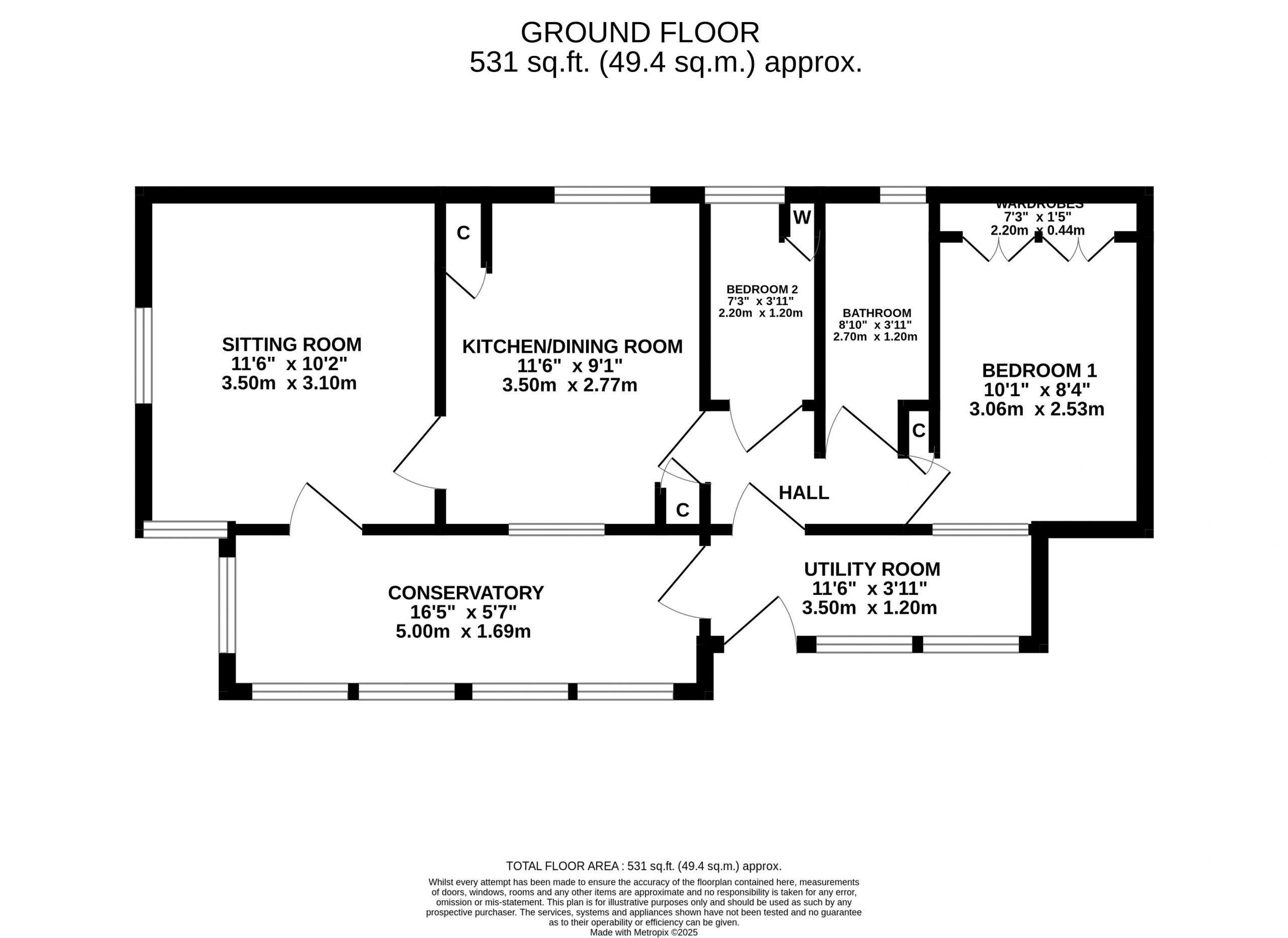 Benefitting from double glazing and central heating, the accommodation comprises, in brief – utility room, entrance hall, kitchen/breakfast room, sitting room, conservatory, 2 bedrooms and a bathroom.